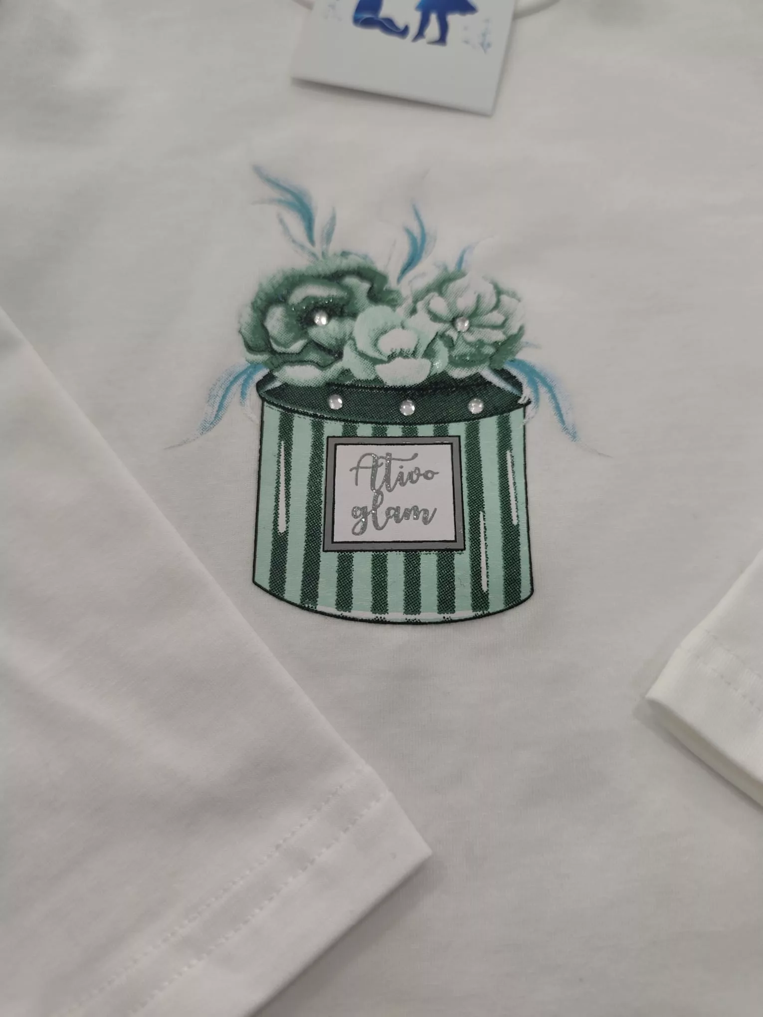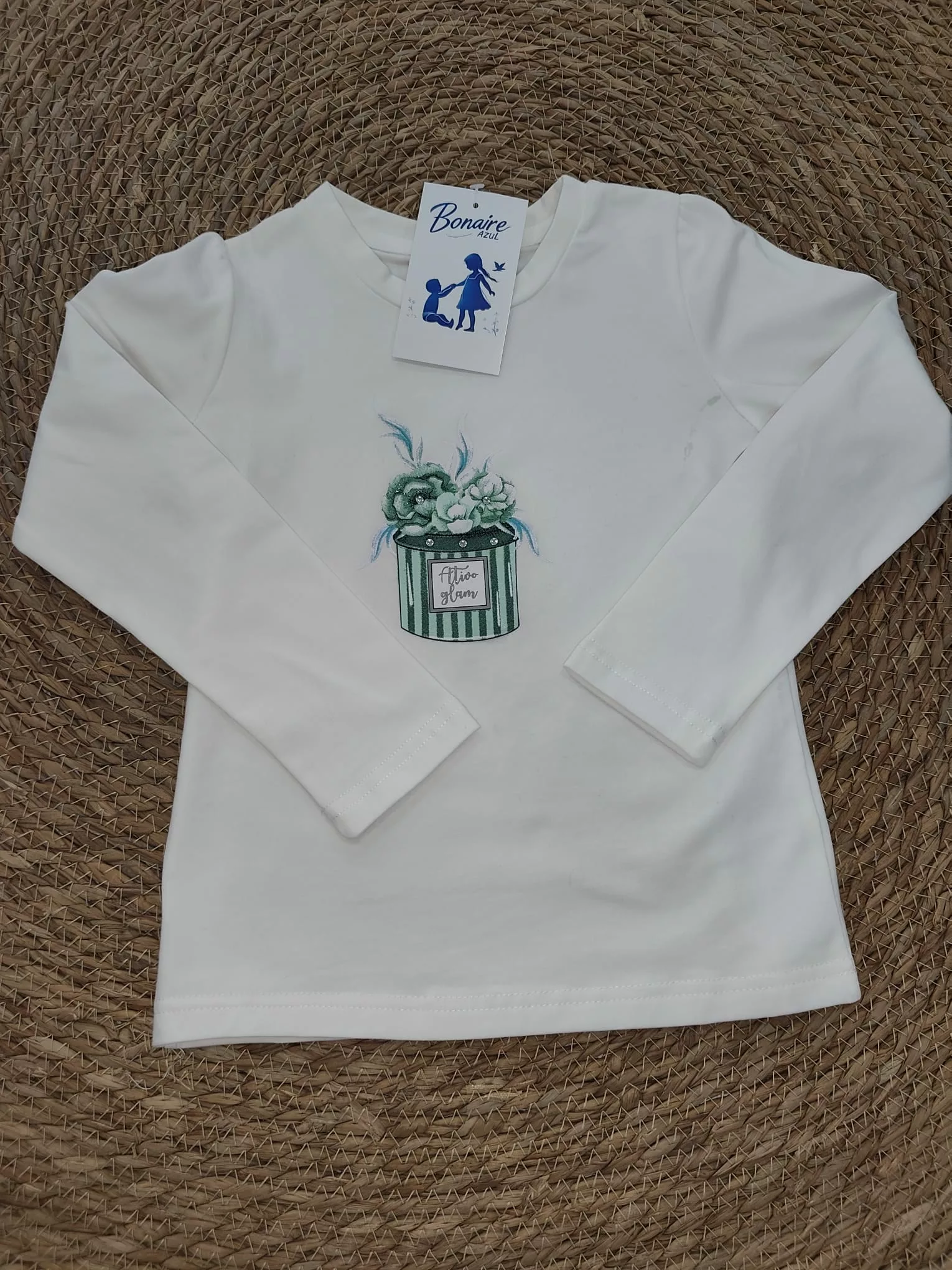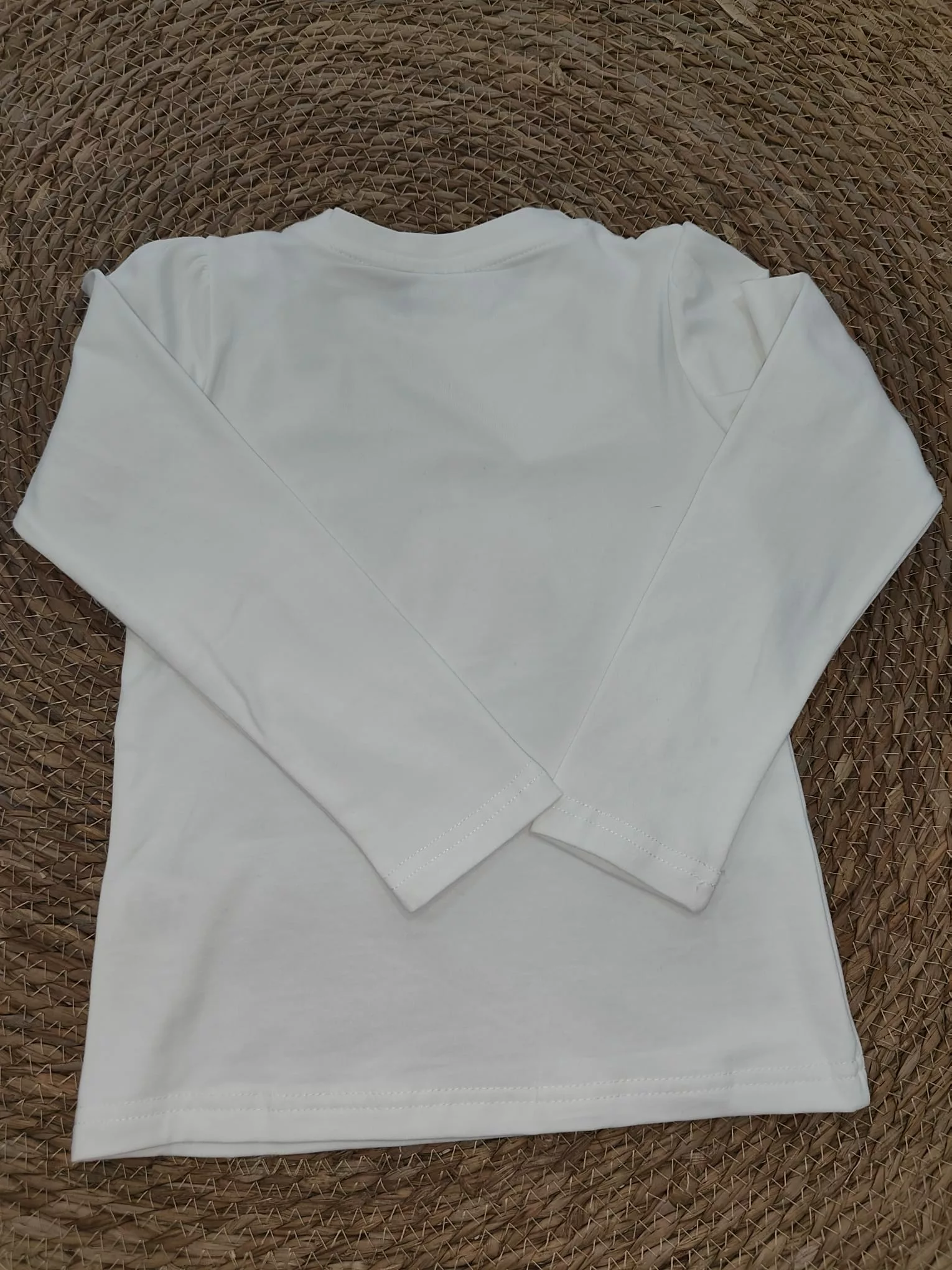 Camiseta niña afelpada con pequeños frunces en el hombro y dibujo en la parte delantera