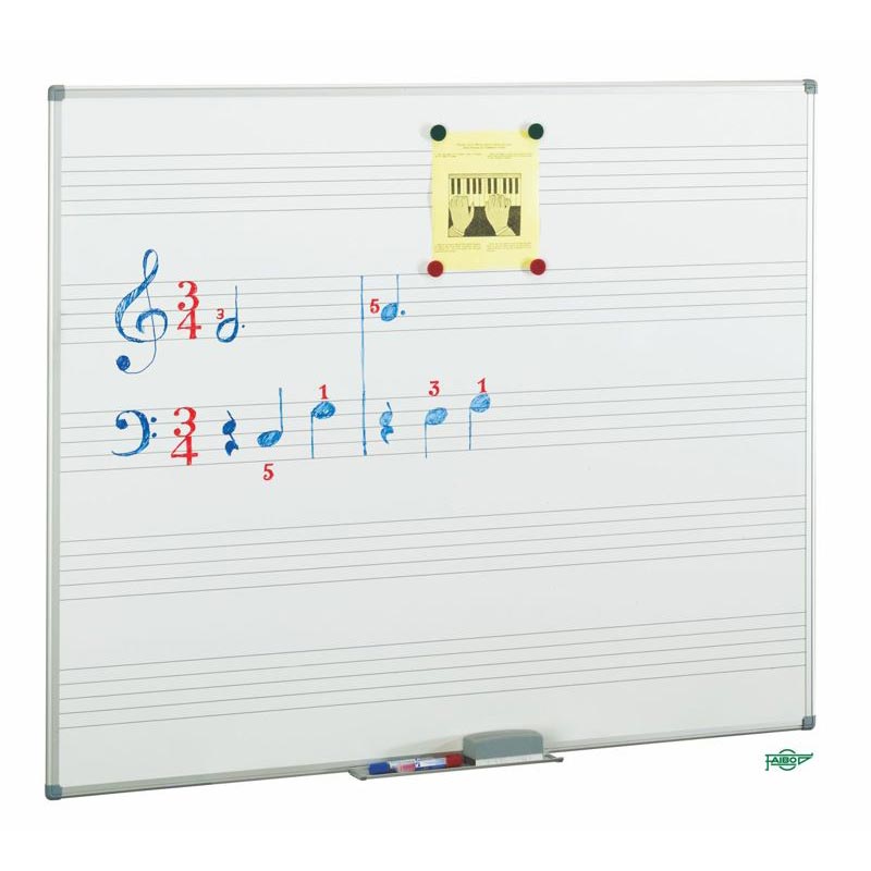 Pizarra con pentagrama y superficie estratificada blanca con 10 años de garantía sobre la superficie. Con marco de aluminio y cajetín. Incorpora 5 pentagramas indelebles. Certificada según Normas UNE EN-14434 y UNE EN-11016. Es 100% reciclable. M