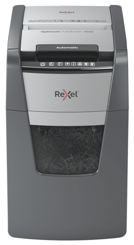 La destructora de microcorte Optimum AutoFeed 150M tritura automáticamente hasta 150 hojas de papel A4 (80 grs.) a la vez, en micro partículas P-5 (2×15 mm). Esta destructora de alimentación automática es una trituradora de oficina sofisticada, con una papelera extraíble de 44 litros. No es necesario alimentar manualmente el papel, ni quitar grapas y clips de papel primero, esta destructora de papel automática hará todo el trabajo por ti.