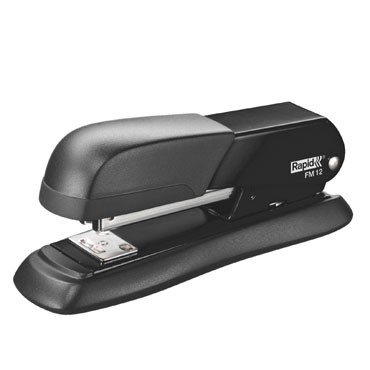 Grapadora / clavadora modelo FM12 metálica de color negro con capacidad de grapado de hasta 25 hojas. Incorpora un refuerzo superior y base de caucho, es ergonómica y precisa y utiliza grapas 24/6 y 26/6