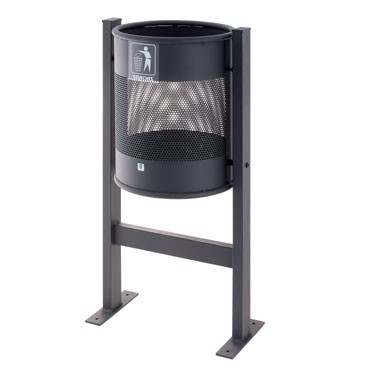 Papelera para exterior modelo P-61 de color gris metálica perforada. Cilíndrica y basculante, incluye soporte para el suelo. Medidas: ø350 x (450 – 900) mm.