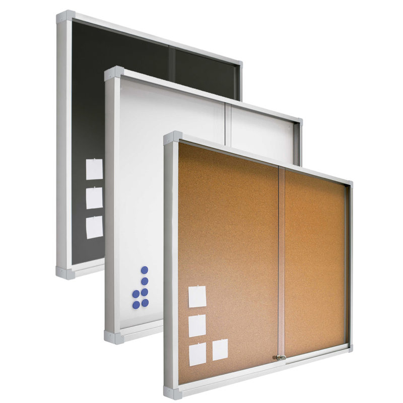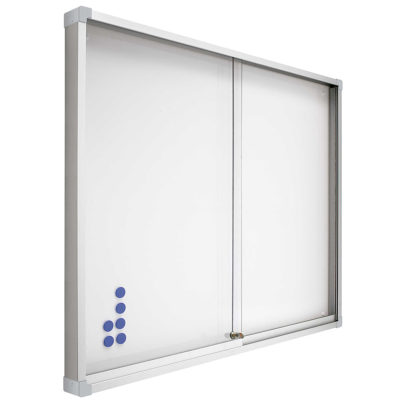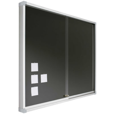 Vitrina de anuncios mural con fondo magnético de pizarra blanca o con fondo magnético gris, marco de aluminio anodizado en color plata mate natural y cantoneras redondeadas de plástico gris, puertas correderas de metacrilato y cerradura con llave. Su superficie metálica permite adaptar material magnético.