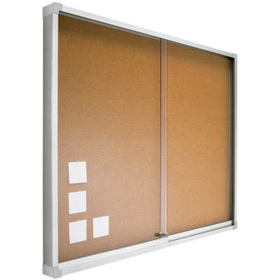 Vitrina de anuncios mural con fondo de corcho natural de 5 mm., marco de aluminio anodizado en color plata mate natural y cantoneras redondeadas de plástico gris, puertas correderas de metacrilato y cerradura con llave. Se pueden fijar sobre su superficie notas, avisos, pósters, etc. mediante agujas o chinchetas.