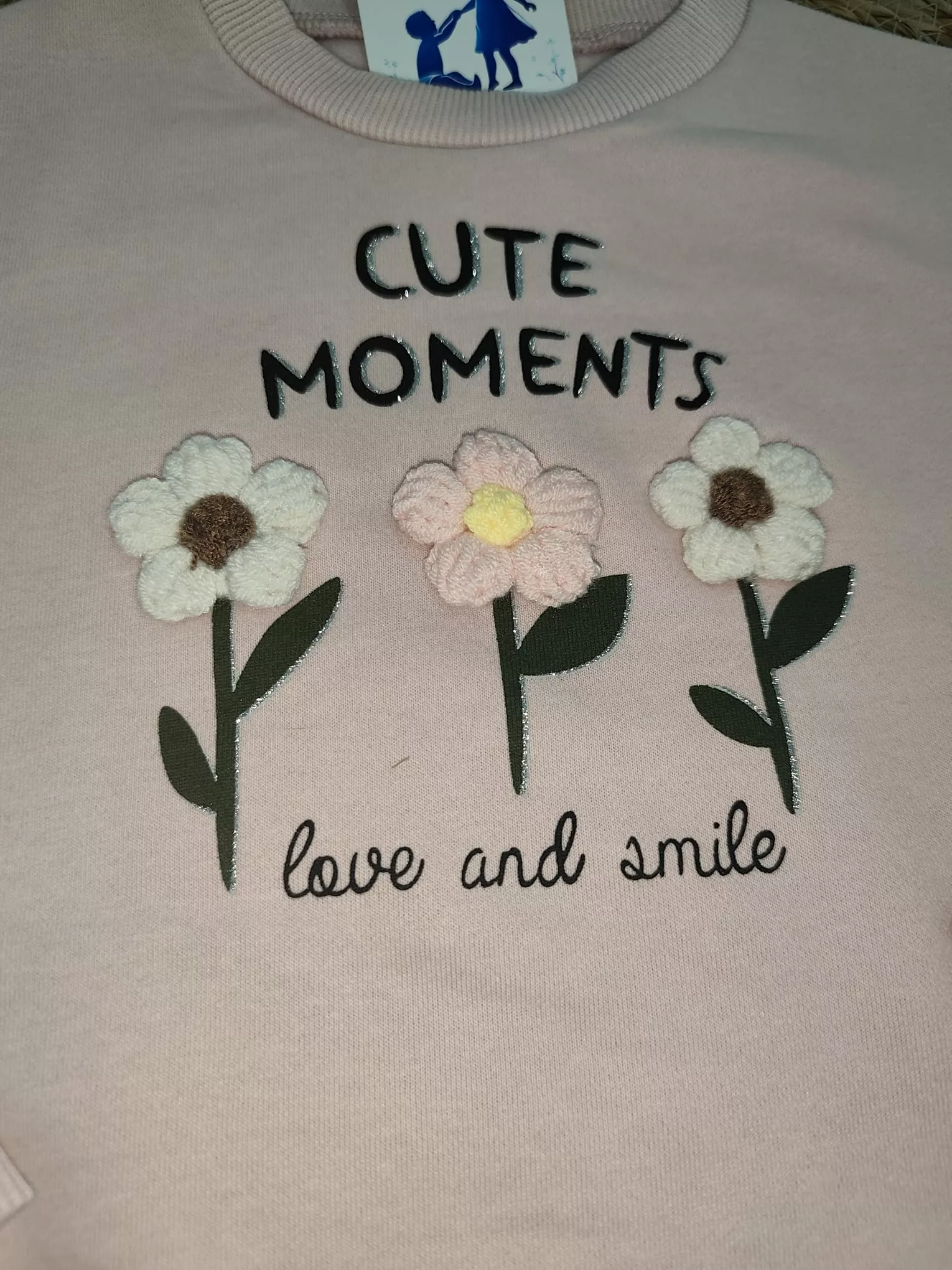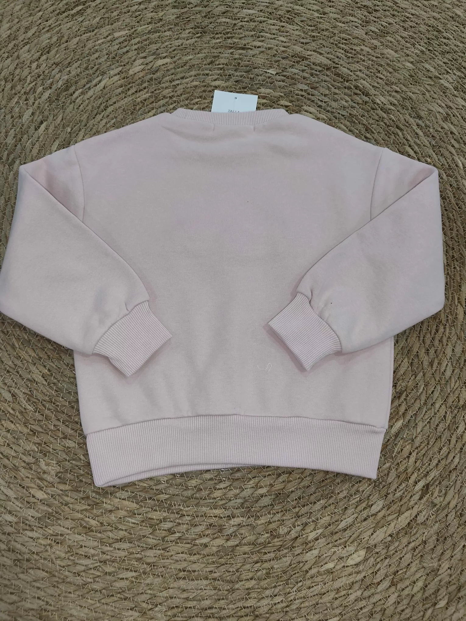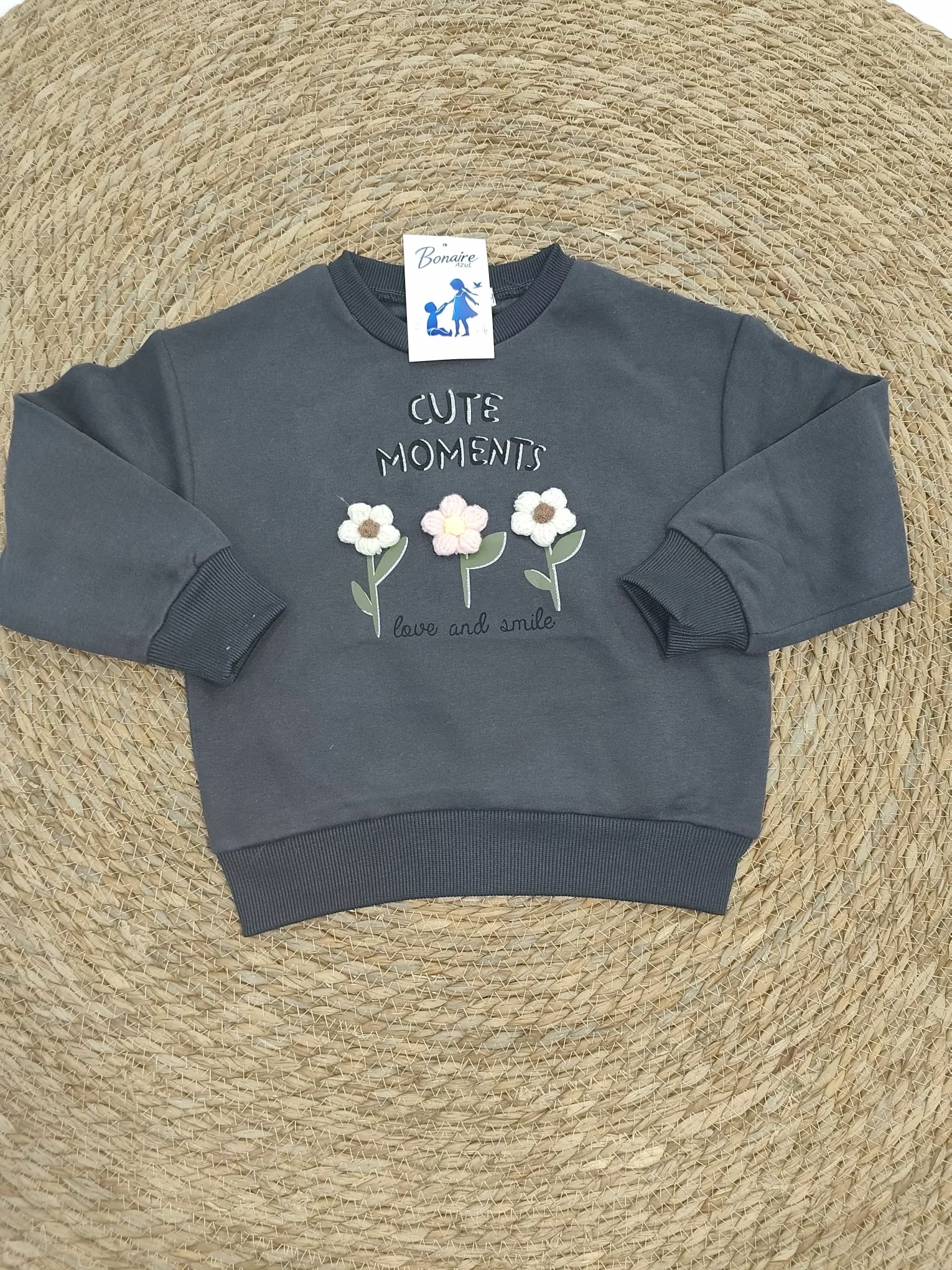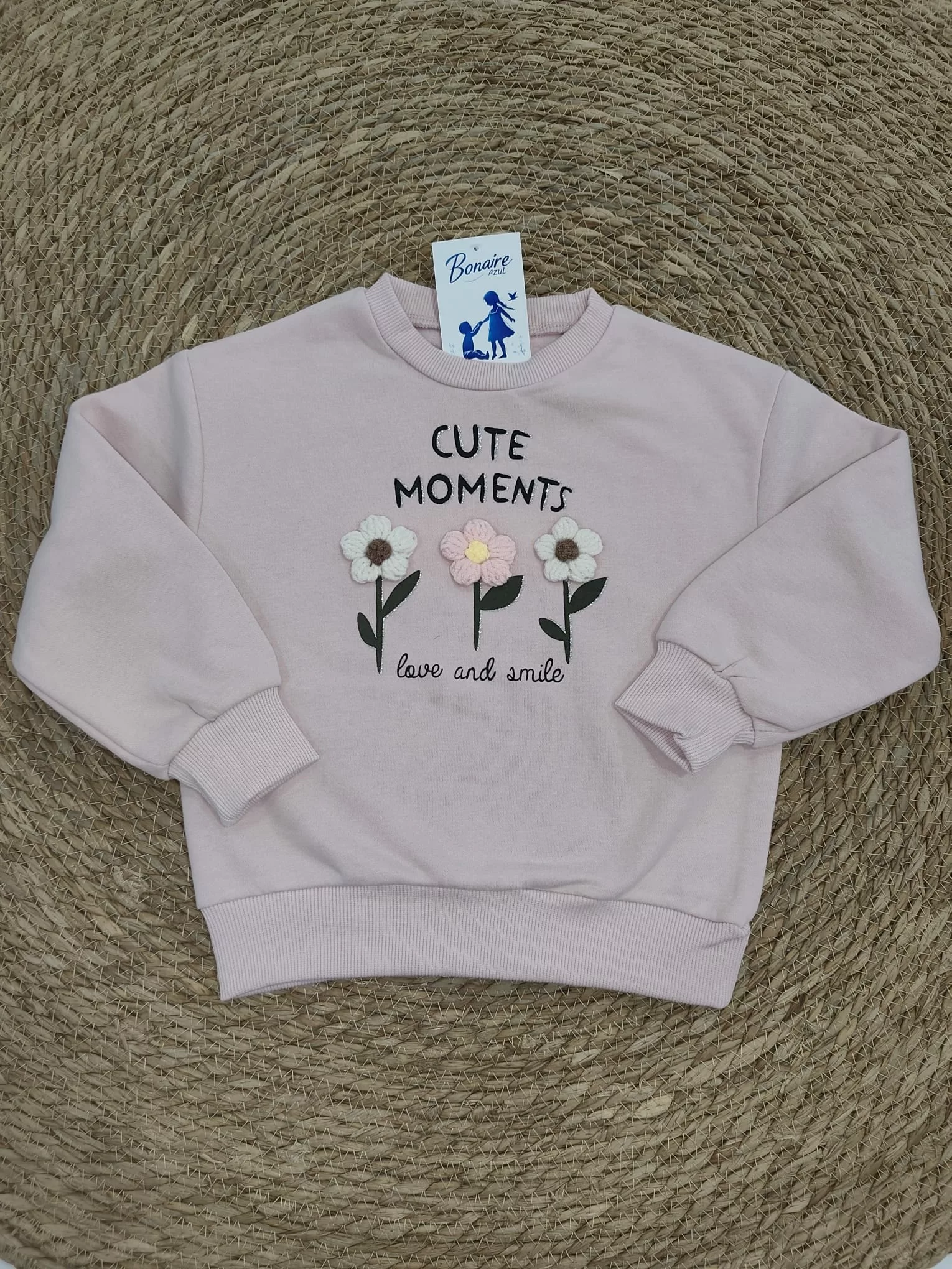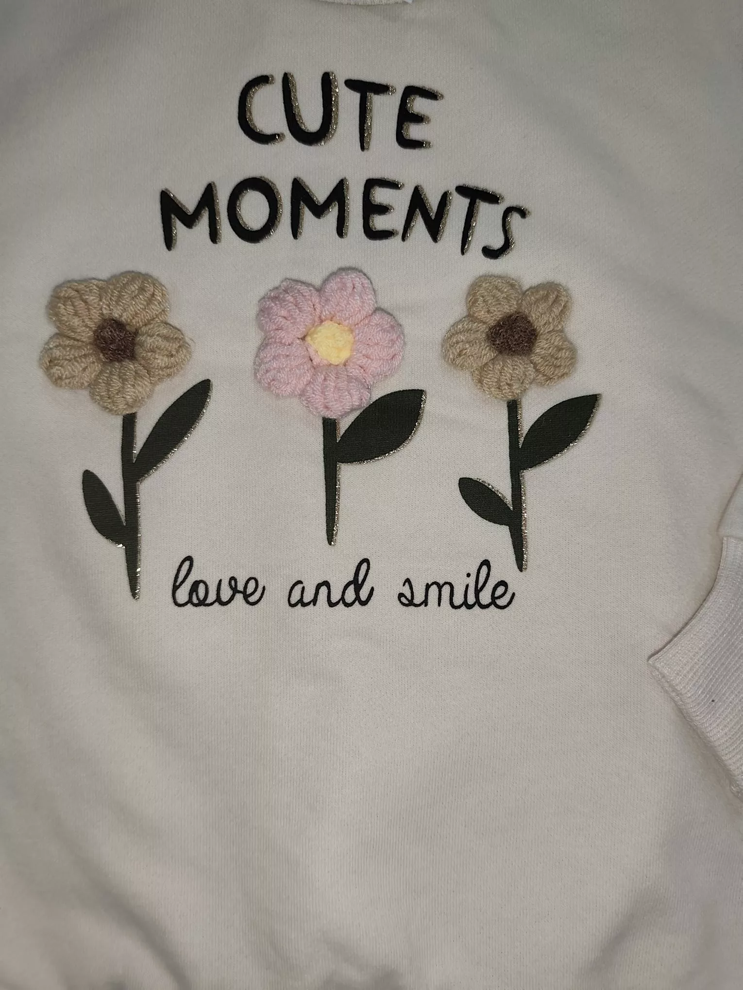 Sudadera lisa con letras de brillantina y flores bordadas de colores en el pecho