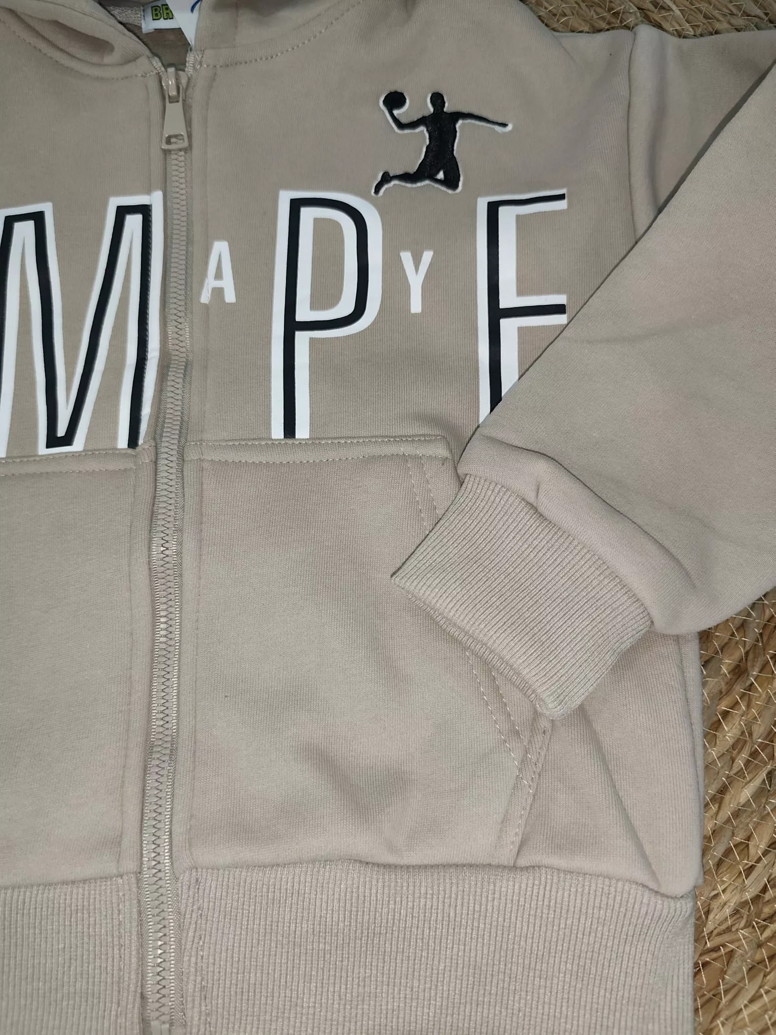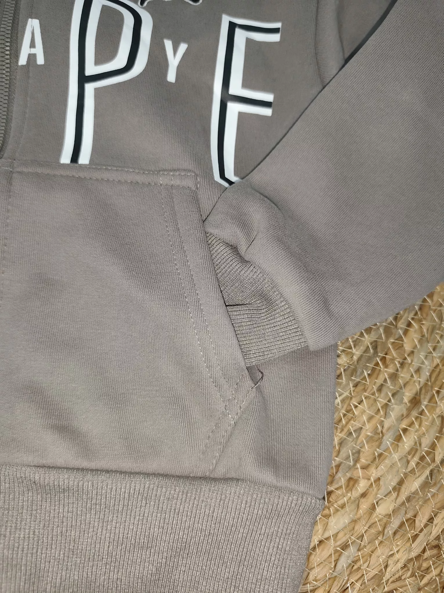 Sudadera con cremallera y gorro,afelpada en el interior. Parte trasera lisa con dibujo y bordado en la parte delantera. Bolsillo canguro